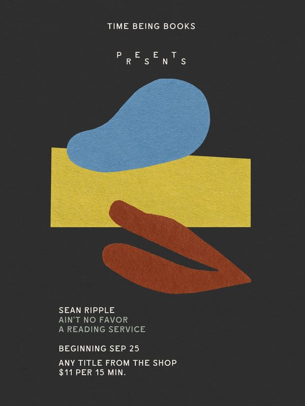In collaboration with Time Being Books, artist Sean Ripple is offering personal reading services for any title purchased from the shop’s collection for a small additional fee