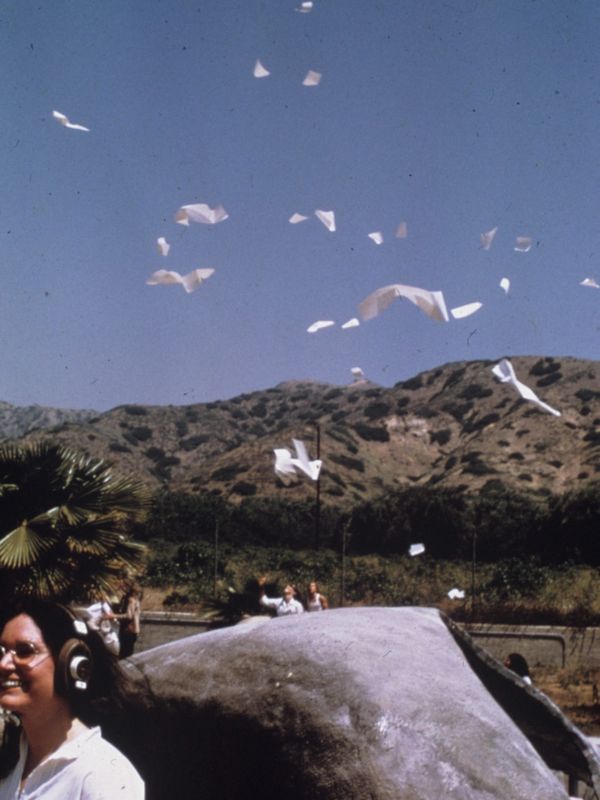 Image: Knowles poem printouts being dropped by helicopter onto the physical house as a performance called Poem Drop in 1971 in collaboration with CalArts students.